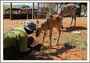 Jango, the orphaned eland joined Lualeni as she was grazing, the Keeper picking soft shoots for him to taste. Meanwhile the orphans were browsing as usual at the Hill and instead of wallowing, rested under shade, before resuming feeding. There was less activity today.