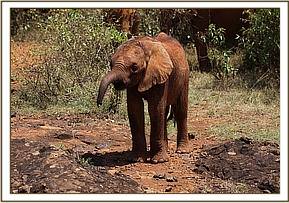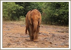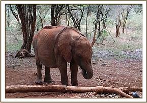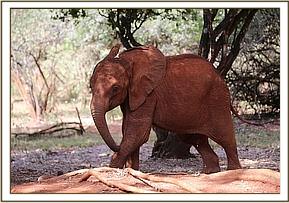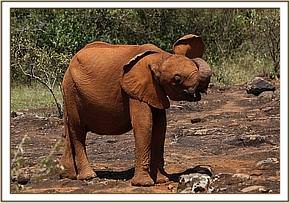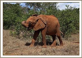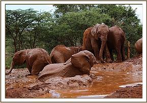 Out during the public visiting hour, soon after the first group of orphans had finished their milk bottles, some of the orphans like Mbegu, Godoma, Pare and Malkia were busy enjoying a mud bath. Others like Murit, Tagwa, Jotto and Ngilai were busy feeding on the greens put out by the keepers, whilst Ambo and Esampu were busy fighting over a water trough and who got the right to draw water from it first. Ambo got hold of Esampu’s tail during their little tussle and pull it with his mouth. This caused the little girl to yell out and run along the rope cordon towards the keepers, to rescue her from the bully boy Ambo! Ambo let her go though before she reached the keepers, and he walked back to draw water from the same water trough, as if victorious in his efforts. Little did he know that the naughty Esampu was walking up behind him quickly for revenge; she pushed him as she walked past and he rolled over the water trough before landing on the ground with a bump! Before he could get up though she was already in the mud pool enjoying splashing around with Mbegu, Godoma, Sana Sana and Pare, and he looked confused as he looked around and tried to work out who had pushed him. He decided to walk into the mud pool and take his anger out by vigorously rolling around in the mud.