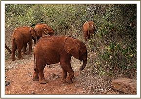 As the orphans were approaching the bushes close to the stockade compound, they were joined by a group of warthogs that are resident in the compound as well. The warthogs had been scared by some lions that had been trying to ambush them that morning near the car park area. This meant the warthogs wanted to spend the rest of the morning in the safety of the herd of elephants and their keepers. However, Kamok, Roi, Kauro, Tusuja, Galla, Maramoja, Naseku and Oltaiyoni had other ideas; they tried to charge and chase the warthogs away, but they in turn were persistent. They kept following them under the cover of the bushes and by standing close to the keepers as well. Jotto and Tamiyoi who are find of standing close to the keepers were frightened and yelled out as they tried to scare the warthogs away from their keepers. This reaction made the keepers try and move the warthogs away as well, but they only moved a few meters away and remained close for the rest of the day.
