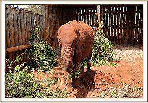 It is the norm when a new elephant arrives that the older orphan females and some of the young ones too crowd around their gate in the morning. Because we have received so many young orphans this month Mbegu has been moved to the stockades further back, which is slightly further away from where the babies sleep as well. It seems as if some of the other orphans were not aware of the arrival of the other orphan yesterday but Mbegu was definitely aware. As soon as she was let out of her stockade this morning she walked right up to his gate. She started browsing on the greens that had been put out for him by his gate, whilst waiting patiently for him to approach. But the new little boy was scared and stayed in the corner of his stockade. A few minutes later Dupotto, Murit, Roi and Kamok joined Mbegu at the door of his stockade. They also shared his branches and greens but after some time of watching him and him not coming any closer, they gave up and started walking off with their friends into the forest.