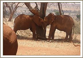 It was a wonderful beginning to the day with the stockade dependant orphan elephants downing a delicious morning milk bottle. They were then joined by Lempaute and Kivuko for some supplement feeding after which there were socializing games with Panda beginning a wonderful game of rolling around in the red soil pile in the stockade compound while Kivuko approached Tundani for a for a pushing game. Ndii noticed Kivuko's advances towards Tundani and went to push Tundani away preventing the two from playing together.