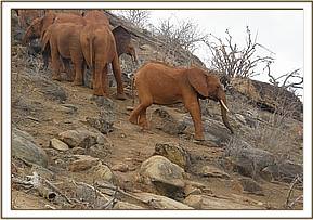 Kenia, Suswa and Panda seemed to be in a lazy mood today as they moved slowly up the hill, falling behind the rest of the group. Panda tried to take a short cut to her friends passing through a trench while Kenia and Suswa took the longer way around, avoiding the slippery area that Panda had passed through.