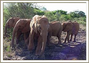 After the mudbath, all the elephants went to the Stables to greet another new arrival from the Shimba Hills area, named Kwali. They all extended their trunks in greeting, after which Naserian went in search of Narripi, who was a short distance away in the bushes with his Keeper. The Keepers had great difficulty persuading Naserian to leave the baby and go with the others into the forest.
