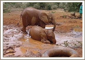 The usual tussle between Rapsu and Buchuma, which began in the bush, went on right into the mudbath hour when the Keepers had difficulty to separate them. Little Kora would have liked to join in, but was restrained by the Keepers, because the tussle had become too intense to risk his involvement.