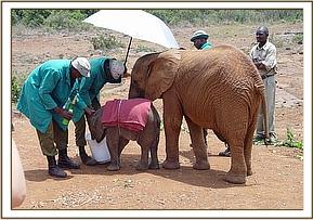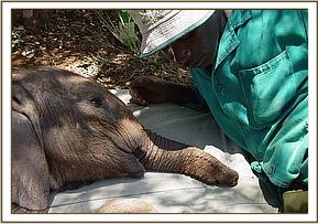 Immediately after the mudbath, Naserian and Lualeni, forcing their way in to touch little Narripi all over his body, but concentrating on his damaged trunk. The Keepers had to force them out.