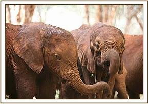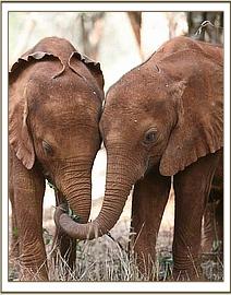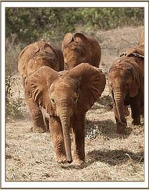The usual 9 a.m. milk feed for the orphans who were out in the bush was a little delayed today, so Olare, Melia, Mawenzi and Enasoit decided to sneak away from the main group, unbeknownst to the Keepers, and make their way back to the Stockades. En route, however, they met up with 2 Keepers who were on their way out, and being guilty, they panicked and fled back to the rest of the elephants out in the bush, who in turn took fright, thinking that something dangerous had frightened the truants, so they, too, fled! The Keepers tried to call them, but to no avail, so the Keepers had to divide themselves into two separate groups and go in search of their charges in order to round them up for their milk feed!