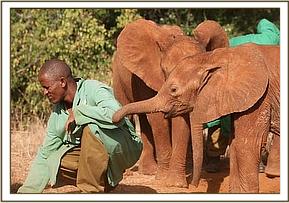 Nchan is a very mischievous little elephant. Today at the mudbath, having rolled in the mud, she went along the line of visitors, putting some mud on each one, as though taught exactly how to do so. All the visitors laughed and enjoyed it!