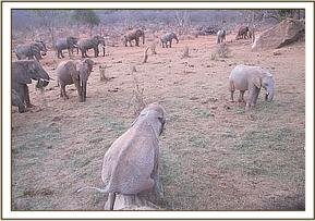 Having taken their Lucerne and water, Shukuru scratched herself against a rock before the Juniors headed out to browse. At the mudbath Rafiki and 10 wild elephant bulls joined them, Kilaguni and Kandecha comfortable to share the water trough with the Big Boys. Later the Juniors were joined buy Lualeni who spent the rest of the day with them.