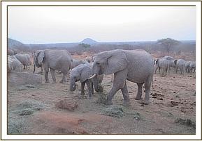 Rafiki and 6 wild male friends came to drink at the Stockades at 6 a.m. joined later by the Ex Orphans who were with Yatta’s wild recruits called Kijana and Mgeni as well as Pembe Moja (the wild Bull with one tusk) all of whom enjoyed some Lucerne. Chaimu then led the herd out into the field, settling to browse the Kone area before heading to the mudbath venue together. The Ex Orphans left with Kandecha after the mudbath, but brought him back to the Stockades at 4.30 p.m. where he waited to again join his Junior peers when they returned in the evening.