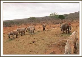 The Big Bull named “Mshale” along with Half Trunk and a group of 10 wild elephants reported for water at the Stockades early in the morning, joined later by another herd of 10 wild elephants. Meanwhile as Tumaren was rubbing her body against a rock, the Ex Orphans began to arrive, and Kandecha and Murka decided to join the Ex Orphans rather than go with the Juniors when they left for the browsing field. At 11 a.m. another wild herd came to drink, three of whom had been arrowed, but only one had the arrow head protruding.