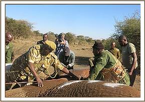 Darts were prepared using three centiliter darts in which 18mgs Etorphine were used and the rest of dart filled with water for injection. Immobilization time was ten minutes on average. On average the collaring exercise took fifteen minutes and the vet unit monitored the animal throughout. Animals were dowsed with water especially on the ears because of high ambient temperatures. Trunks were straightened and a piece of stick placed at the open end across to maintain patency.
