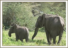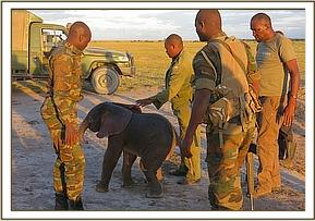 The mother heard the baby trumpet and after only covering less than a kilometer towards nearby shrubs we spotted the mothers’ trunk above the shrubs picking scent to our direction and presumed she was the one. We quickly stopped and off loaded the calf from the pick-up. By this time mother was about a hundred meters away. The calf trumpeted again and the mother charged. We quickly took off and she charged at us for about fifty meters before going back to the calf. She inspected it and recognized it. She offered it teats to suckle and it was a successful reunion.