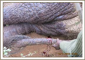 On physical examination the elephant had a penetrating wound to the right hind quarters and tip of tail. The wound was fresh probably about 24 hrs old and most likely caused by a spear. The wounds were then thoroughly cleaned using clean water and Hydrogen Peroxide. It was then lavaged using tincture of Iodine. Topical antibiotic cream and green clay was then applied into the wound to facilitate healing and avoid infection. The elephant was then injected with 100 ml Betamox L.A and 100 ml Dexamethasone at different sites intramuscularly. The entire operation lasted about 30 minutes.