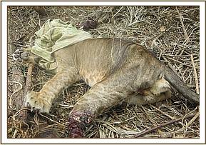 A foul smell was emanating from the snared left hind limb wound. It was observed that the winch snare was anchored onto a tree branch resulting to tether-like action on the snared lion. Snare wire was just below the hock joint from where the lion had self-mutilated the rest of the limb as it tried to remove the snare. Exposed metatarsus joint bone components were evident of the trauma suffered giving an indication of an amputated limb. The wounds were heavily infested with maggots meaning the animal had been trapped for more than a week without food or water. This was also depicted by emaciation and dehydration of the animal.