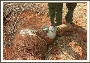 It was darted with 1.5mgs Etorphine in 1.5cc dart filled with 500I.U Hyalase. Vehicle darting was used and the elephant was within a family of ten individuals. The dart landed on the right gluteal muscle; he was slowly limping on the left hind limb. The aim was to immediately chase the other family members to a safe distance immediately after the calf went down following narcosis. It was fully immobilized in five minutes assuming right lateral recumbence.Promptly thefamily members were chased away using one vehicle as the other vehicle remained to safeguard the vet team. The left ear was used as blind fold and trunk was kept patent with aid of a piece of stick across distal open end.