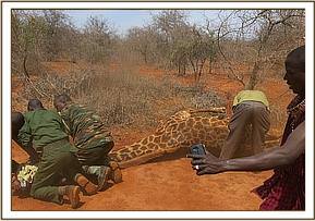 The giraffe was reported by Big Life scouts as having been snared on the right hind limb. The Amboseli Unit responded promptly and met Serengei Conservancy led by the warden on the ground.