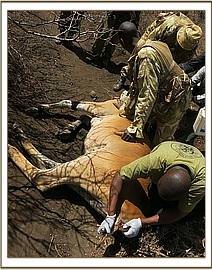 It was established that the carcass belonged to the previously treated candidate who succumbed to injuries thereafter. The fracture on the left hind limb was seen as severe lameness (before death) of the affected limb. The skin break at the right gluteal area and sole perforation on the same limb conformed to antemortem pathology witnessed during treatment. The ivory had been poached possibly by poachers who trailed the animal to its death location or someone who bumped into the carcass by chance. Serengei Ranch is vast and thickly forested. It is patrolled by game scouts who patrol on foot making effective coverage almost impossible. This could have contributed to lack of timely spotting of the carcass there before.