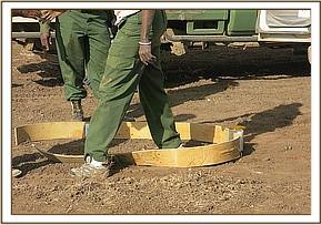 It was darted with 13mgs Etorphine in 1.5cc dart filled with water for injection. It was in some shrubs which made the approach by vehicle impossible, thus the animal was darted on foot. The dart landed on the right rump prompting the animal to run away with difficulties. It was fully immobilized in seven minutes assuming a sitting position. It was pushed to the left lateral recumbence manually. The right ear was used as blind fold and trunk was kept patent with the aid of a piece of stick at extreme open end.