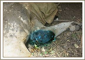 A blind fold was placed on the eyes. It was observed that before darting it was exhibiting panting due to high ambient temperature. It was fully engorged as depicted by swollen stomach indicating a good meal in less than twelve hours earlier. Examination revealed swollen pus discharging left elbow joint occasioned by what appeared to be multiple bite marks. This was assumed to have been caused by other lion(s) through territorial fights as their mating season culminates. This injury caused hopping lameness on the said limb as confirmed by the guide who spotted it. No any other injury was observed.
