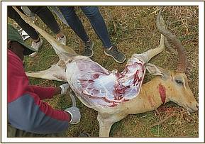 While on surveillance patrol within the park the Mobile Vet Unit spotted vultures dropping down on the ground indicative of a carcass. We drove near only to discover a fresh carcass of a grant gazelle. It was still warm meaning it had just died. Its’ eyes had been gorged out, its’ perineum and testis had been predated on by the vultures. It was on left lateral recumbence. A postmortem ensued to establish the possible cause of death.