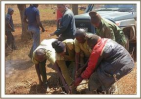 We thought and attempted to cut down one side of the well by digging but it was very hard due to stones. This also was not forthcoming. Instead we tried to create a slope for the elephant to climb out. We carefully threw in the well avoiding hitting the elephant all dead woods which were around, stones, and hard mud bricks from one edge to create a slope. We then placed the strap from front all the way round through the gluteal and manually by use of seven men tried to support it out as she climbed out. It was amazing how she easily and calmly she eventually came out. We left it under keen watch of the community ranch scouts as it trailed the family members.