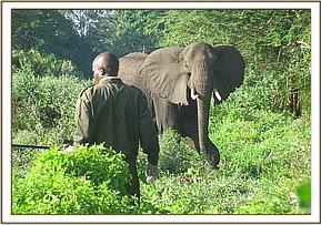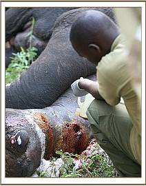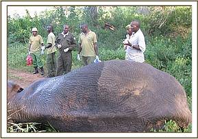 Early in the month the Umani Camp staff sighted a bull elephant in great distress suffering from severe wounds on the front leg and chest. The Chyulu Team alerted the David Sheldrick Wildlife Trust Headquarters who organized a rescue team with a KWS Vet to fly from Nairobi to Umani in an effort to save this elephants life. The Vet landed at about 5pm and the Team accompanied him to the sight of the injured elephant. The elephant was darted and closely examined.