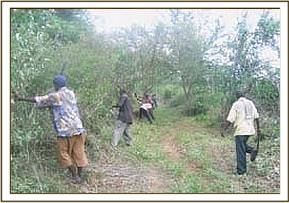 Buffalo bent During the second week of our operations we combined road clearing supervision with our desnaring activities. On the first day of our patrols we arrested two poachers just after they had crossed the river into the park. The poachers were in possession of 2 knives, a panga, bows, two poisoned arrows, axes and other personal items.