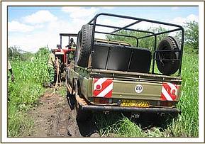 TUNDANI, UMAUMA, TIVA RIVER STRETCH Most sections of the road have been washed away by the heavy rains leaving deep gulleys which make patrols in some sections unbearable. Other road sections such as at Kanziko and Mathae are waterlogged and impassable. We got stuck on Mathae road on our way to the Kanziko gate and had to be pulled out by the tractor.