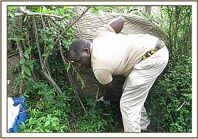 He was restrained chemically by use of 12mgs Etorphine hydrochloride delivered through a 1.5ml dan-inject dart.Darting was done from foot given this elephant was in a thicket. It took eight minutes for the drugs to take full effect with the elephant assuming right lateral recumbency. He had to be turned over to facilitate easier examination of the affected limbs.