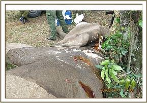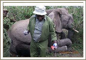 Restraint was achieved chemically by use of 13mgsetorphine hydrochloride delivered through a 1.5 dainjectdart.Darting was done from a vehicle. It took eight minutes for the drugs to take full effect with the elephant assuming sternal recumbency having moved to a small thicket. Though the posture was not the best, it presented a good position for wound examination and handling and this was done quickly before the elephant being flipped over to his lateral position for the remainder of the treatments.This was a spear wound which had turned septic with pus forming a pouch ventrally. An opening was created at the most ventral position of the swelling for effective pus drainage.