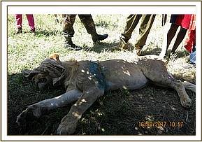 Closer examination revealed that this was a lion treated couple of months back at Talek area for a serious spear wound on his left hindleg.The injury had damaged the knee joint with the joint capsuled being torn and synovial fluid partly escaping. His condition then was bad as he could not use the leg completely. The joint was closed with sutures and the wound margins apposed. He healed completely but with a limp. The fresh wound was cleaned, disinfected with tincture of iodine and oxytetracycline spray applied.More treatments involved parenteral administration of 3000mgs amoxicillin antibiotic, 16mgs dexamethasone sodium anti-inflammatory and cotasal which helps in muscle and nerve regeneration.