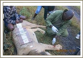 Restraint was achieved chemically by use of a combination of 4.8mgs medetomidine and 200mgs ketamine delivered remotely through a 3mldaninject dart.Darting was carried out from a vehicle. It took seven minutes for the drugs to take full effect with the lion assuming sternal recumbency. After confirming that he was stable, examination was conducted. He had a fresh bite wound on her back, sacral region of the spine. His left hind leg had no fresh injury but had poor musculature attributed to dystrophy of disuse. No fracture was detected.