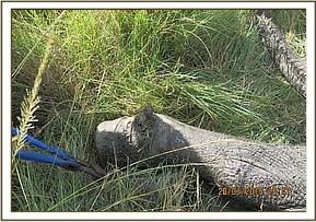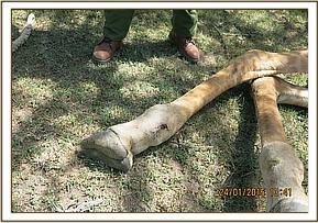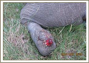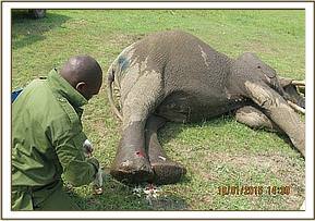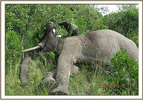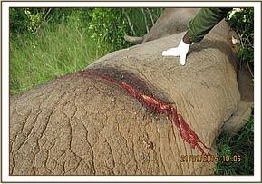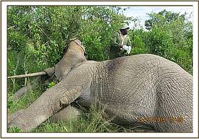 Immobilization was achieved chemically by use of 17mgs Etorphine Hydrochloride delivered remotely through a 3ml Dan Inject dart using a vehicle. Upon darting, this elephant ran for a few minutes towards a small bush but was overwhelmed by the drugs in seven minutes. He went down on his right lateral affording us a good chance to examine the wounds.