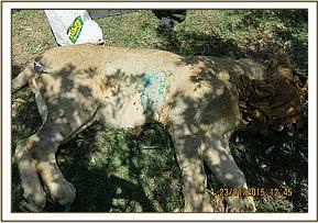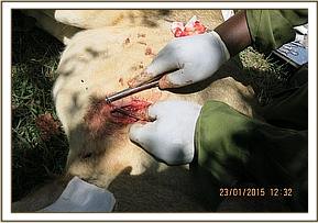 Examination revealed a deep sharp edged penetrating wound measuring seven inches wide and deep enough to access the pleural cavity between two ribs. The wound was most likely caused by spearing. The lion was breathing with difficulty and some air was escaping from the pleural cavity through the wound opening causing rapid, shallow breathing. A big blood clot was found on the edge of the wound margin and more blood clots were suspected to be within the pleural cavity. This, combined with the leakage of air through the wound could have led to limited lung movement and the rapid shallow breathing. Treatment was done quickly in order to stabilize the animal and prevent further deterioration.
