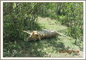 This young male was seen with an obvious injury on his right upper thoracic region by Mara North Conservancy rangers. He was in a pride of about nine members that was alleged to have feasted on a cow a few days before. The rangers called the Vet Unit to seek assistance to treat this lion. This lion was seen close to the other members of his pride but spent most of the time lying down. He appeared weak with a visible wound to his upper right thoracic region. He appeared to be having difficulty breathing.