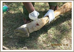 Examination revealed a septic wound round his left carpal joint that had been caused by a snare. The snare had since fallen off, but it had left behind a big wound and had caused partial damage to some ligaments. The wound was thoroughly probed for any snare remnants, but nothing was found. The wound was cleaned with Hydrogen Peroxide and copious amount of water. Gauze swabs were used to wipe it dry and necrotic tissues removed.