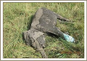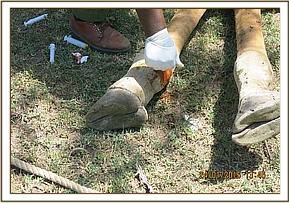Immobilization was done by use of 13mgs Etorphine Hydrochloride delivered remotely through a 3ml Dan Inject dart. Darting was done from vehicle. It took eight minutes for the drugs to take full effect with this elephant assuming sternal recumbence. Once he was down, the mother would not initially let us approach him, but with help of more than two vehicles, she was eventually convinced to give the Vet Unit access to her calf. After making sure the elephant was stable, quick examination of the affected limb revealed an old snare wound at the heel. The snare had since fallen off leaving a raw wound, which appeared relatively clean. A sterile gauze soaked in dilute Hydrogen Peroxide was used to swab the wound to remove necrotic debris. Clean water was then used to rinse the wound before tincture of Iodine being applied as disinfectant. Oxytetracycline wound spray was then used topically before a coat of green clay being applied to promote healing.