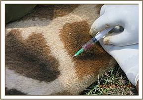 Reversal was achieved by administration of 30mgs Diprenorphine intravenously through the jugular vein. The giraffe woke up in one minute and galloped off to rejoin the rest of the herd.