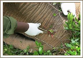 The drugs took full effect after eight minutes with the elephant going down on his left lateral. The protective family members were scared away by use of vehicles in order to give room for this elephant to be attended to. Due to the high ambient temperature, a lot of water was used to douse the elephant. His eyes were infused with Cloxacillin eye ointment to prevent corneal desiccation and his right ear was used as blindfold. His airways were kept open throughout the procedure by use of a small stick to keep the nostrils dilated.