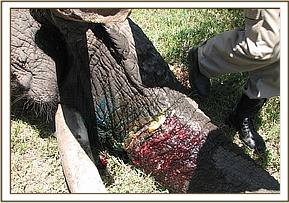 The elephant was darted from a vehicle using 17mgs of etorphine Hcl combined with 2500 i.u on the left thigh. The drug took effect after about 6 minutes and it became recumbent. The wounds were then examined pressed and cut open to drain all the pus and necrotic debris completely. The wounds were then cleaned with a lot of water and gauze swabs removing all the pus and necrotic tissues.