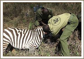 This particular zebra was found with a wire snare around the neck and we decided to rescue it. The wire was removed after it was captured by chemical immobilization by darting from a vehicle. Then the animal was revived and released back to the wild.