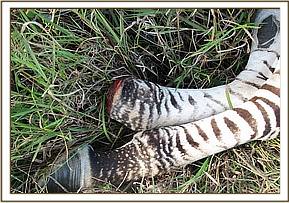 Zebra probably with a sprain. It was also chemically immobilized and the limb examined closely. The animal had a dislocation on the tarsal joint of the right hind limb; this was undergoing the healing process. It was treated with long acting antibiotics and dexamethasone administered intramuscularly then revived from anaesthesia.