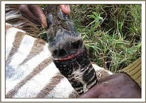 This was a female juvenile zebra that had a snare wound on its left hind limb. One of these was a juvenile female zebra that was not able to keep pace with others and we decided to attend to it. The animal was physically restrained using a rope since it was too young and unable to move fast.