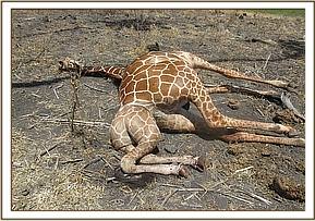 On 17/08/17, visitors on game drive in Meru National Park reported that a female reticulated giraffe had a dead fetus hanging on its birth canal. It was reported to be in poor body condition and recumbent. They requested for veterinary intervention to remove the dead fetus. However, the giraffe died before it was attended.