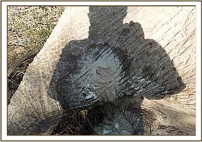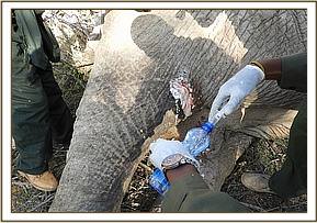 The spear wound penetrated approximately 30cm into the right shoulder muscle. It seems this animal was speared from a cliff. The spear was pulled out and the resultant wound and another wound on the elephant’s right hind limb were flushed with dilute hydrogen peroxide and disinfected using dilute tincture iodine. Green clay was smeared on the wound to speed up wound healing.