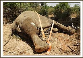 The elephant was immobilized using 20mg of Etorphine Hydrochloride and went down on sternal recumbency. Its two herd members were scared off with rifle fire and help of a vehicle before it was positioned on lateral recumbency.
