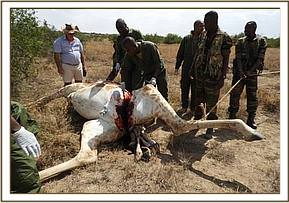 We found this zebra during routine patrol in the Park. It showed loss of body condition, circling movements and showed no fear of humans when approached on foot. It had been left behind by its herd mates. We immobilized the zebra to evaluate the cause of illness.
