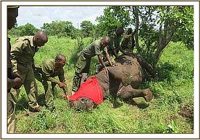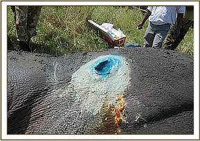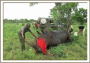 A white rhino was treated in Meru National Park for cutaneous filarial wounds following reports from the rhino monitoring team. Affected rhinos showed extensive wounds on the skin. Treatment was required to prevent wound expansion and infection.
