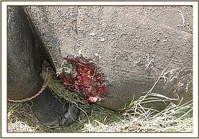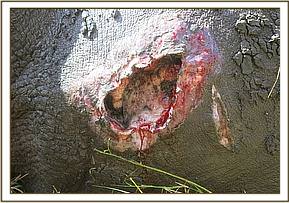Examination showed lacerations on its external genitalia and hind quarters suggestive of fight wounds. These wounds may have been inflicted during attempted mating and consequent calf separation. Because of soft tissue trauma the rhino was reluctant to move.