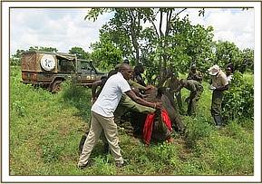 The Rhino was agitated prior to darting and ran some distance before going down, therefore to manage risk of hyperthermia it was doused with plenty of water. A blind fold was applied to reduce visual stress. It was then roped to right lateral recumbency for examination and treatment.